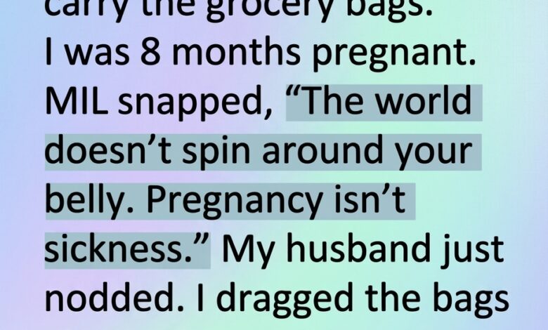 By the eighth month of my pregnancy, even simple tasks had become exhausting. My body felt heavier each day, and every step required a little more effort than before. One evening after returning from the grocery store with my husband, I asked if he could help carry the bags inside. It was a simple request—one that felt reasonable given how far along I was. But before he could respond, my mother-in-law sharply interrupted, insisting that pregnancy was not an excuse and that the world did not revolve around me. What hurt even more was my husband’s silence, which made me feel completely unsupported.