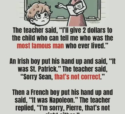 She clapped her hands once and said, “Alright class, today I have a special question. I’ll give two dollars to the child who can tell me who they think is the most famous man who has ever lived.”
