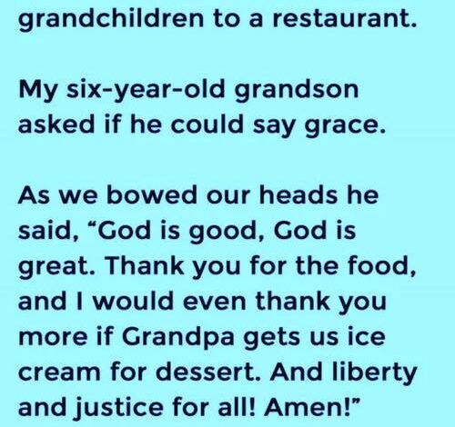 He said, “God is good, God is great. Thank you for the food… and I would thank you even more if Grandpa gets us ice cream for dessert. And liberty and justice for all. Amen.”
