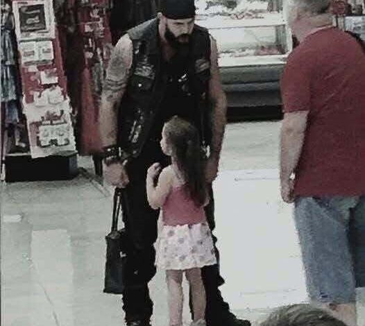From nowhere, a small figure appeared, dashing past aisles, weaving through carts, her tiny feet barely making a sound against the hard tile. She was a six-year-old girl, small for her age, her cheeks streaked with tears, her eyes wide with fear, and she ran straight into the arms of a massive man wearing a black leather vest covered in patches, the emblem of the Demons Motorcycle Club emblazoned across his back. The contrast between her frailty and his imposing presence made several shoppers freeze mid-step, some instinctively stepping back, unsure whether to intervene or watch.