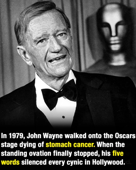 Ultimately, Wayne agreed to attend. His arrival at the ceremony became one of the most emotional entrances in Oscar history. As he appeared in the auditorium, the entire audience rose to its feet almost instantly. The standing ovation continued far longer than usual, reflecting both admiration and deep emotional respect for everything he represented.