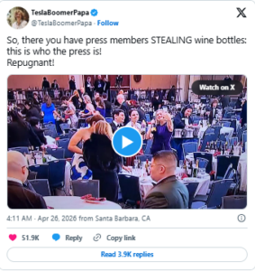 In the widely shared footage, some individuals can be seen collecting items from tables, including bottles that appear to be part of the event’s dining service. The context of these actions is unclear, as the video does not show the full timeline of the evacuation or whether items were being removed as part of standard event procedures. No official statement has confirmed the identity or intentions of the individuals shown in the clip.